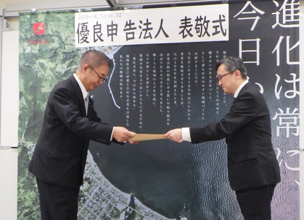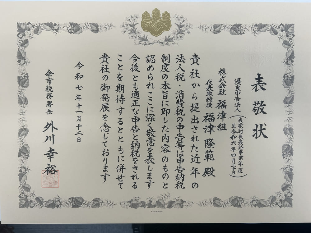 令和7年11月12日(水)、余市税務署長より優良申告法人として表敬状を頂戴しました。