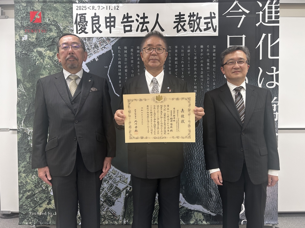 優良申告法人の表敬は福津組としてはもちろん、余市税務署管内としても初めてと伺っております。 長い年月にわたり、適切な会計処理を行い、適正な申告・納税を行ってきたことが認められた今回の表敬は、大変名誉なことです。