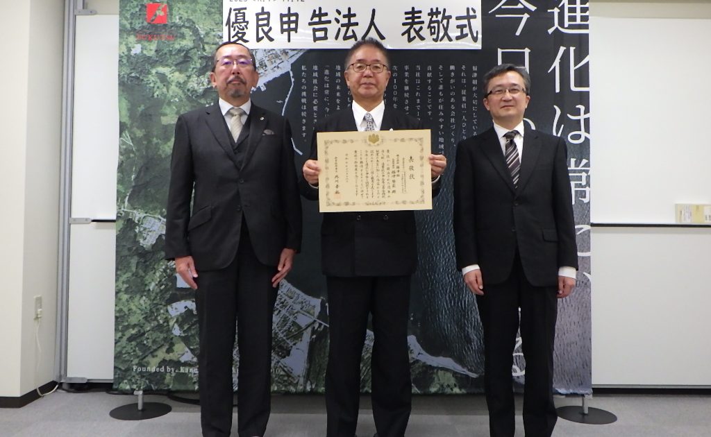 優良申告法人の表敬は福津組としてはもちろん、余市税務署管内としても初めてと伺っております。 長い年月にわたり、適切な会計処理を行い、適正な申告・納税を行ってきたことが認められた今回の表敬は、大変名誉なことです。