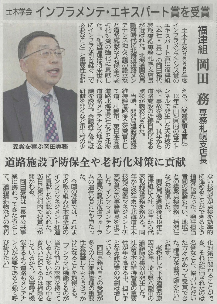 当社代表取締役専務 札幌支店長が土木学会 令和七年度インフラメンテナンスエキスパート賞を受賞いたしました