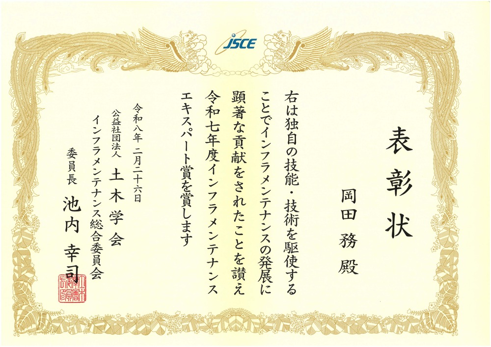 令和8年2月26日(木)に行われた、土木学会 2025年度インフラメンテナンス賞 表彰式にて、当社の代表取締役専務 札幌支店長の岡田がインフラメンテナンスエキスパート賞を受賞しました。