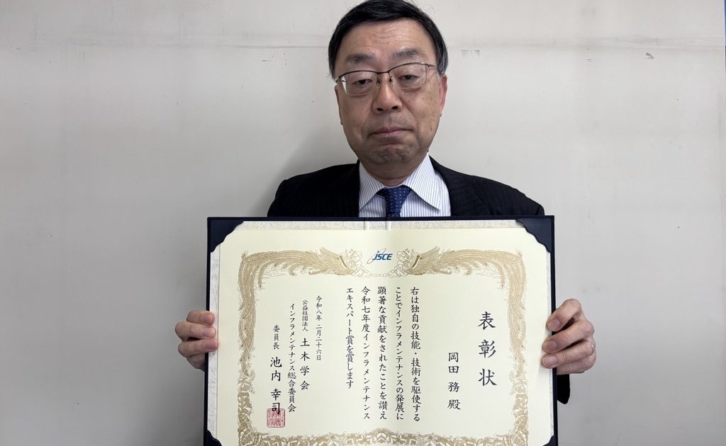 令和8年2月26日(木)に行われた、土木学会 2025年度インフラメンテナンス賞 表彰式にて、当社の代表取締役専務 札幌支店長の岡田がインフラメンテナンスエキスパート賞を受賞しました。