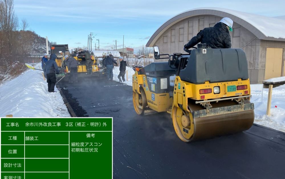 Q.どんな工事? 洪水被害を防いで、地域の安全性を高めます ・余市川:堤防天端をアスファルトで舗装し、堤防を保護します。これにより、雨水の浸透を抑制するとともに、越水時には法肩部の崩壊の進行を遅らせ、堤防決壊までの時間を少しでも延ばします。 ・古平川:河川幅を広げ、水の流れる面積を大きくして洪水時の水位を低下させます。さらに、排水樋門を設置することで、洪水時に川から水路への逆流を防ぎ、災害の発生を防止します。 Q.この工事の特徴は? 河川幅を広げるための河道掘削はICT土工による施工 ICT土工の導入により、掘削作業では3D設計データを用いたマシンガイダンス仕様のパワーショベルを活用することで、オペレーターが掘削の深さや形状をモニターに映し出された3D図面を確認しながら設計通りに仕上げることができます。 また、丁張の設置作業が不要となることにより、人員の削減や作業時間の短縮、建設機械周辺での作業が減ることにより、作業員の安全性向上に繋げることができます。 Q.工事担当者コメント 後志管内は大型工事が多く発注されており、人手不足の厳しさが増す9月に本工事が発注された事により、自社労務者や協力業者の乗り込みが遅れ、工事の遅延が発生しました。工程短縮を実現するため、ICT建機を使用することで、丁張り設置の待ち時間や手戻り等が無くなり、作業効率を向上させました。また、コンクリート配合を変更(早強・耐寒剤セメント)によって養生期間を短縮し、工期内に完成することができました。 |