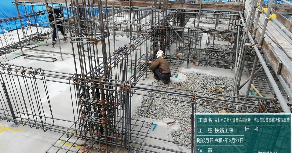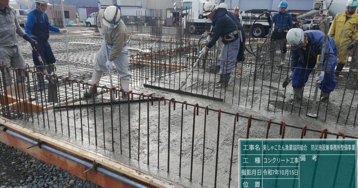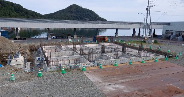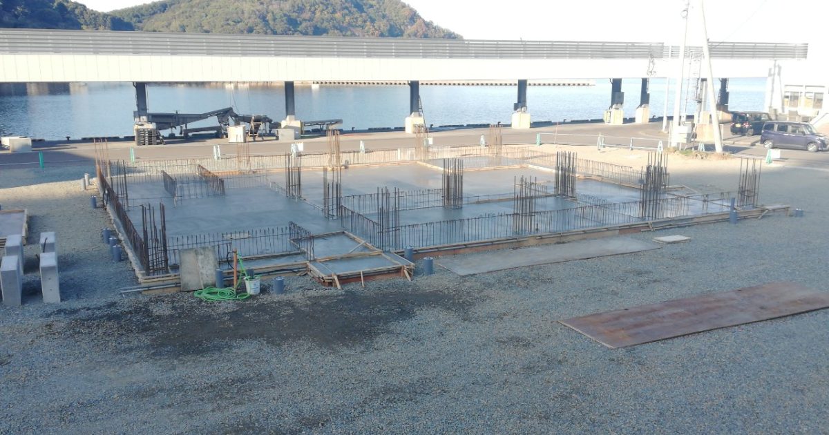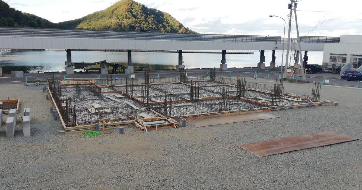 Q.どんな工事? 本工事は、平時の漁業協同組合事務所としての機能に加え,災害時の防災拠点となる施設を建設する工事です。 Q.この工事の特徴は? 水没環境下での施工管理 建設地が海に近接し、基礎底盤が海水位を下回る設計であったため、根切り作業(掘削作業)においては山側からの湧水に加え、海水の浸入が常時発生する極めて困難な条件下での作業となりました。施工にあたっては、常時継続的に水中ポンプにより排水を行いながら施工を進めました。 Q.工事担当者コメント 本工事の現場は海岸に隣接しており、過去の近隣施設(冷凍冷蔵施設)の施工実績から、掘削時の海水処理が求められました。そのため、事前に水中ポンプや沈砂槽を十分に配備して臨みましたが、過去の工事よりも施工エリアが海岸に接近していたため、過去の工事を上回る水量の流入があり、大きな排水能力を持つ水中ポンプを使用しました。 また、工程管理の面では、建物周囲の付随工事(浄化槽工事、屋外電気・給排水設備工事、外構工事)を基礎工事と並行して実施しました。これにより、重機や作業員の待機を最小限に抑え、限られた工期内での効率的な工程管理に努めました。 |