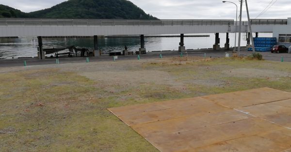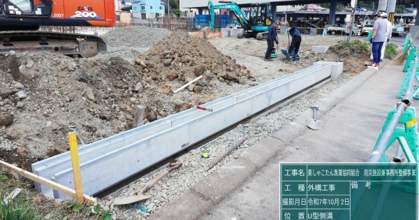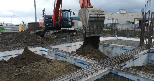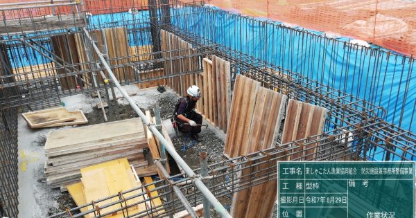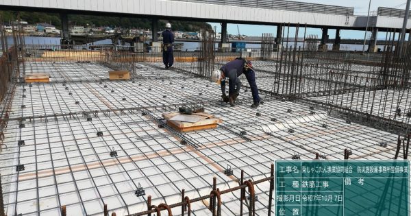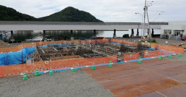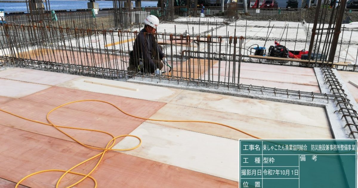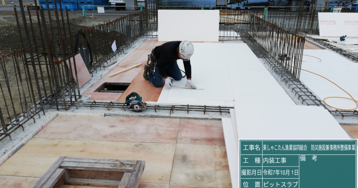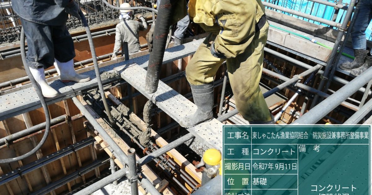 Q.どんな工事? 本工事は、平時の漁業協同組合事務所としての機能に加え,災害時の防災拠点となる施設を建設する工事です。 Q.この工事の特徴は? 水没環境下での施工管理 建設地が海に近接し、基礎底盤が海水位を下回る設計であったため、根切り作業(掘削作業)においては山側からの湧水に加え、海水の浸入が常時発生する極めて困難な条件下での作業となりました。施工にあたっては、常時継続的に水中ポンプにより排水を行いながら施工を進めました。 Q.工事担当者コメント 本工事の現場は海岸に隣接しており、過去の近隣施設(冷凍冷蔵施設)の施工実績から、掘削時の海水処理が求められました。そのため、事前に水中ポンプや沈砂槽を十分に配備して臨みましたが、過去の工事よりも施工エリアが海岸に接近していたため、過去の工事を上回る水量の流入があり、大きな排水能力を持つ水中ポンプを使用しました。 また、工程管理の面では、建物周囲の付随工事(浄化槽工事、屋外電気・給排水設備工事、外構工事)を基礎工事と並行して実施しました。これにより、重機や作業員の待機を最小限に抑え、限られた工期内での効率的な工程管理に努めました。 |